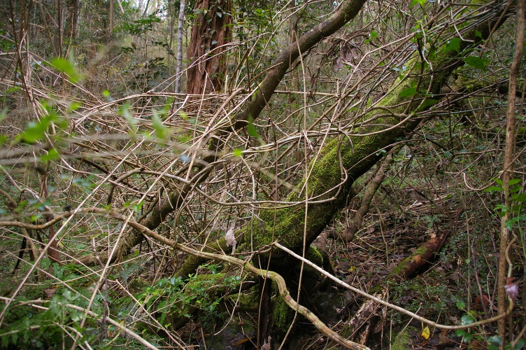 believe happened here.The Tallowood is about 15 metres away from the Parsonsia straminea roots which are here, the vine wanders over the ground via a circuitous route, up the hill a bit then down toward the gully then over to the tree. There could be 25 metres or more of vine on the ground, but that is more trunk to strike root from.